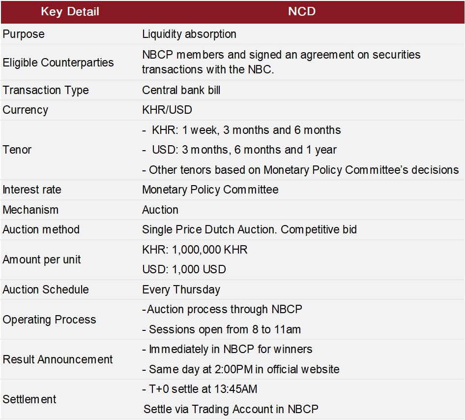 The bills are issued in both KHR and USD and are dematerialized and registered in the NBC Platform (NBCP), an electronic system used for custody and trading of the NCD, and for other interbank transactions operated by the NBC.