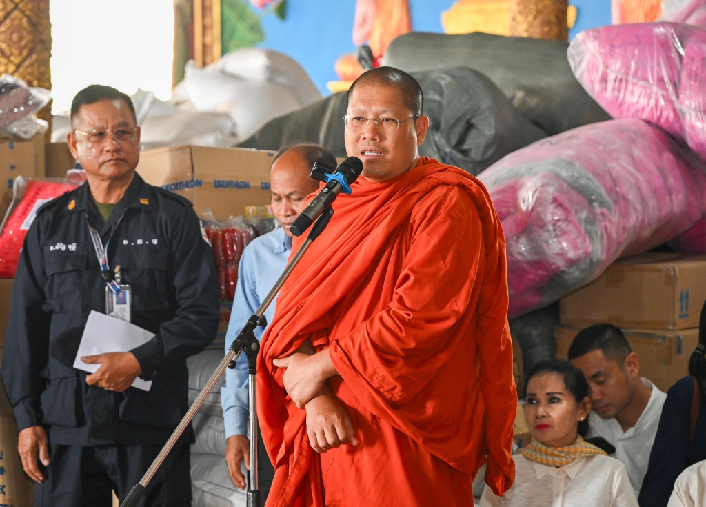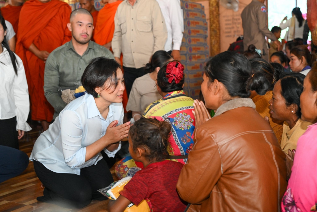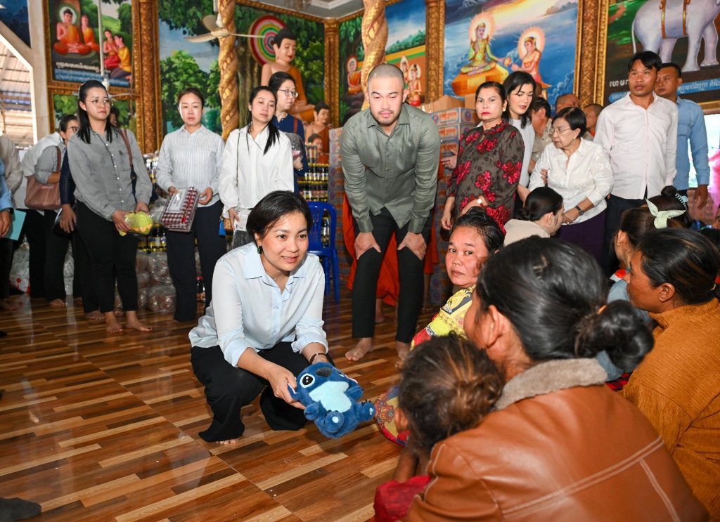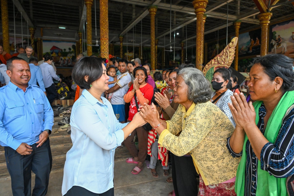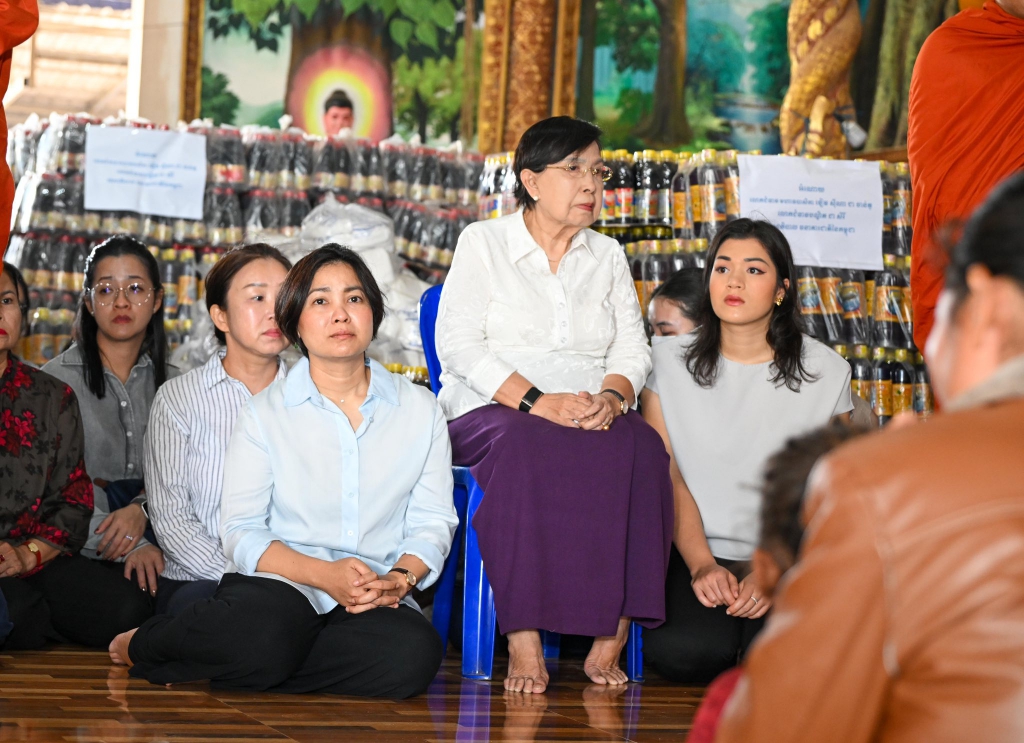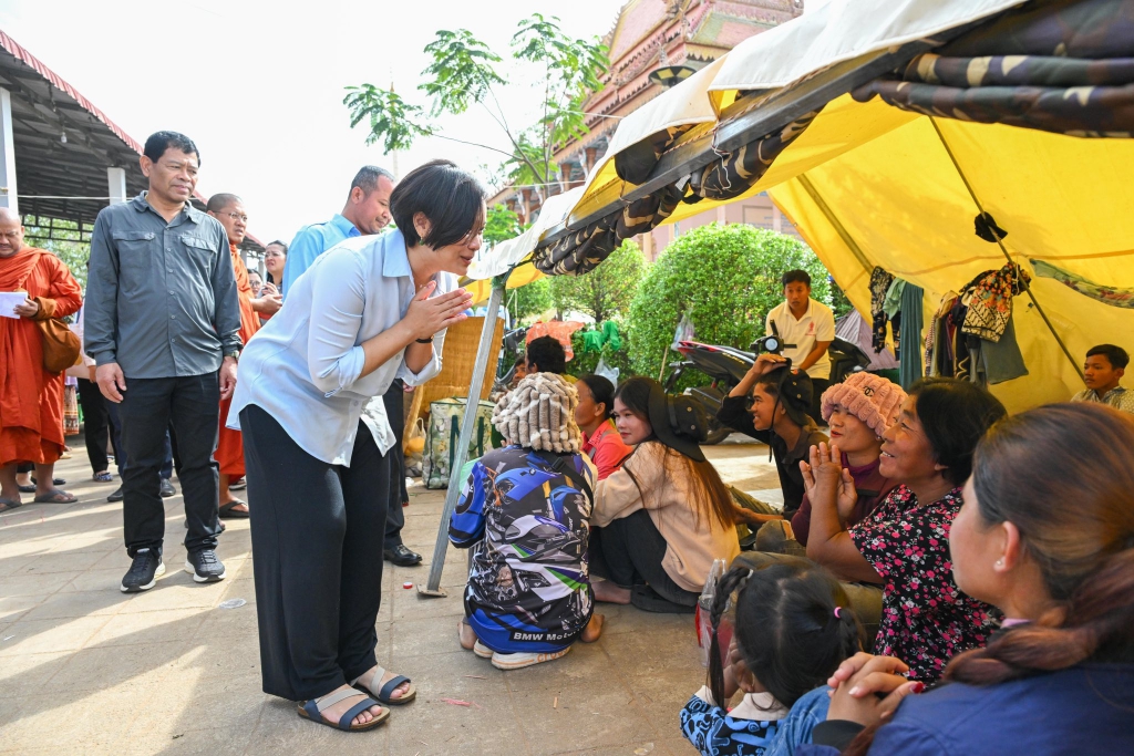 H.E. Dr. Chea Serey, Governor of the National Bank of Cambodia, led officials and staff of the National Bank of Cambodia on a visit to convey sympathy and deliver food supplies and various essential items to displaced people at a shelter site