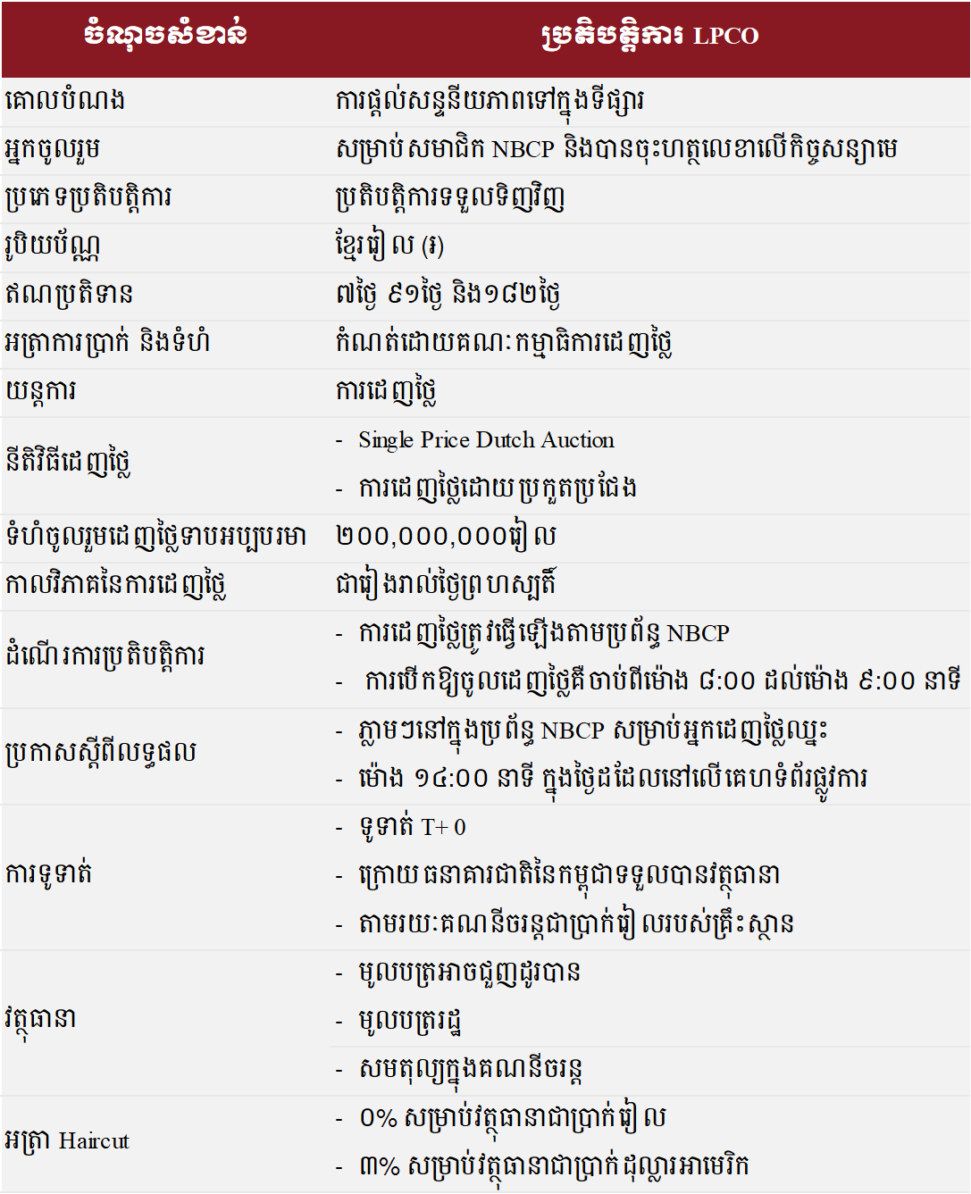 ធនាគារជាតិនៃកម្ពុជាធ្វើការកំណត់ទំហំ និងអត្រាសម្រាប់ដាក់ឱ្យដេញថ្លៃជារៀងរាល់សប្តាហ៍។ គ្រឹះស្ថានធនាគារ និងហិរញ្ញវត្ថុដែលជាសមាជិកថ្នាលធនាគារជាតិនៃកម្ពុជា (NBCP) អាចចូលរួមបានតាមរយៈការដេញថ្លៃនៅក្នុងប្រព័ន្ធ NBCP ដោយត្រូវផ្តល់ព័ត៌មាននូវទំហំទឹកប្រាក់ដែលស្នើសុំ និងអត្រាការប្រាក់។