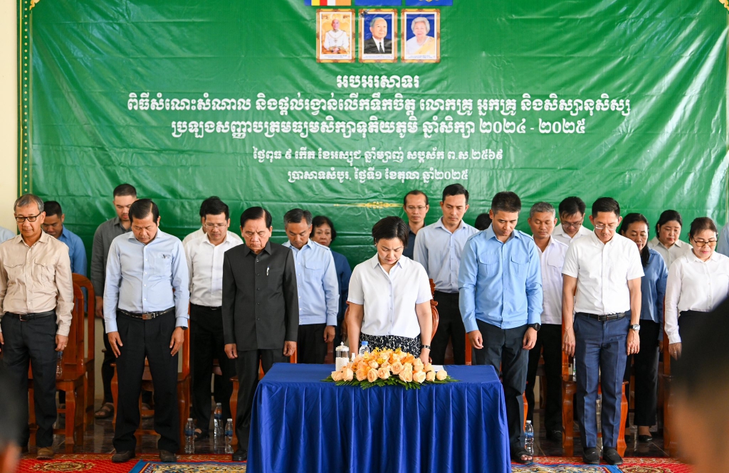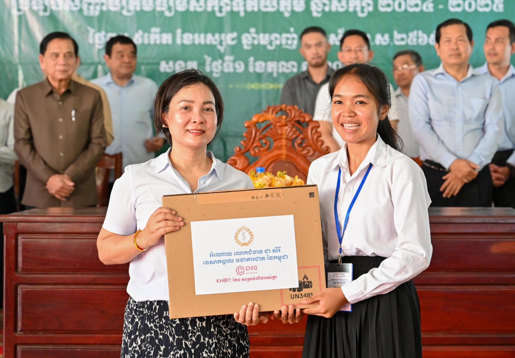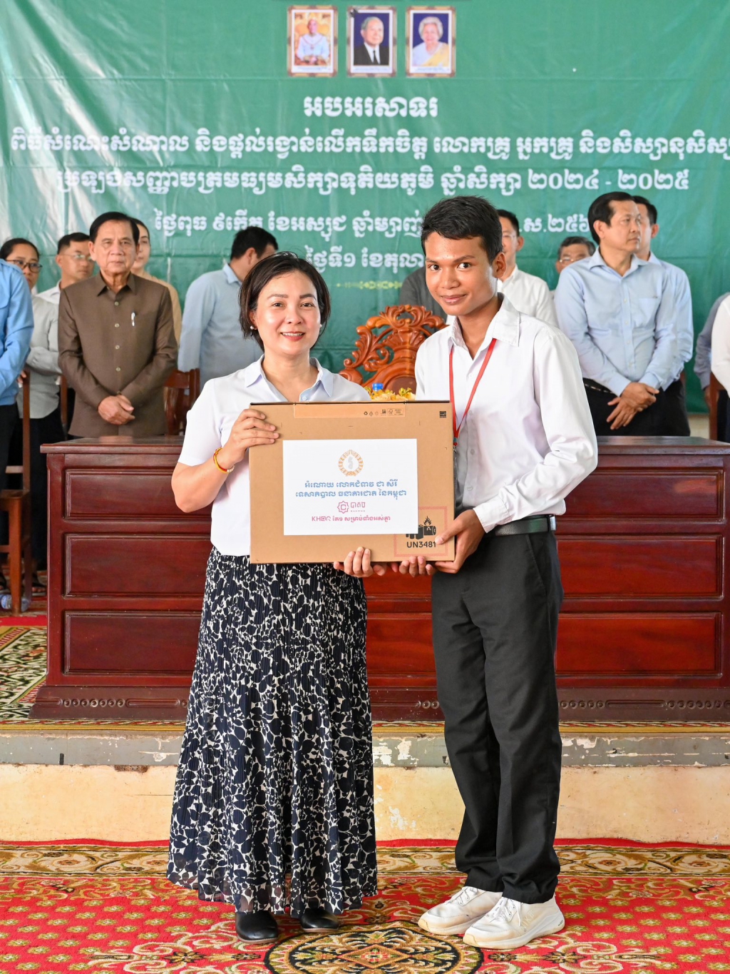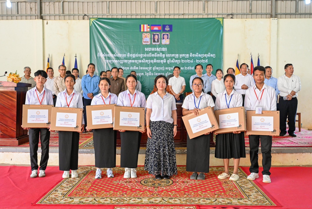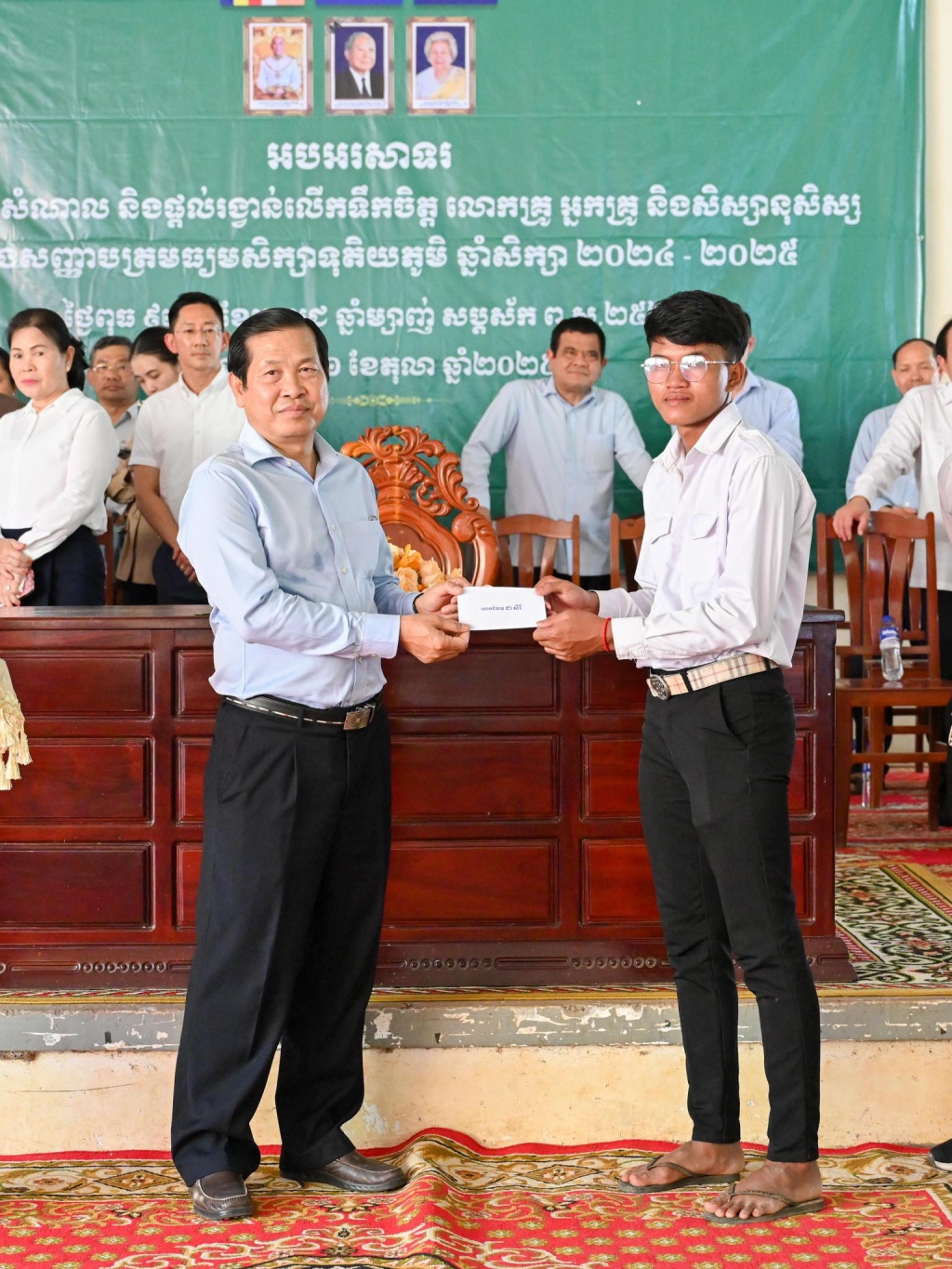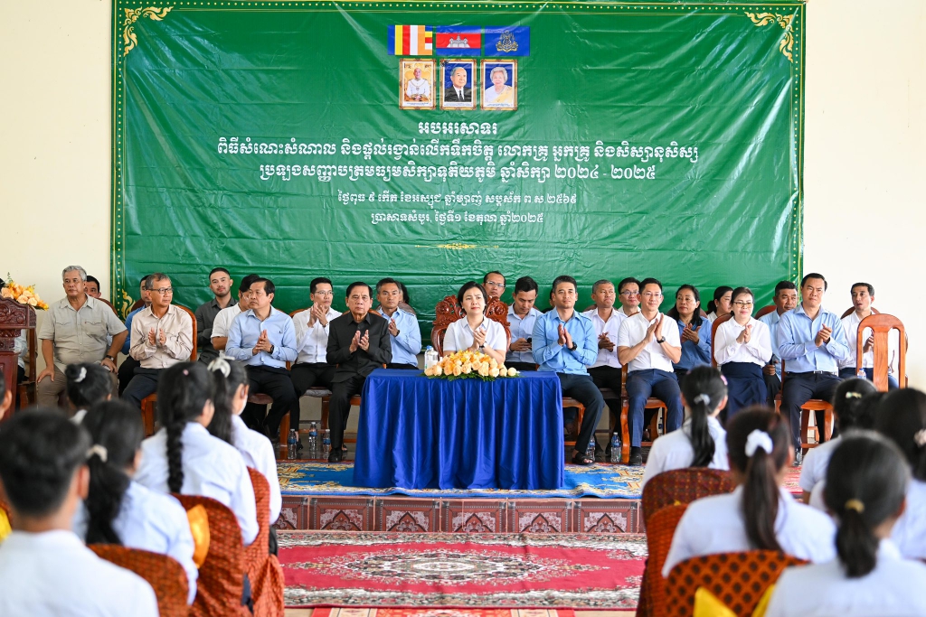 លោកជំទាវបណ្ឌិត ជា សិរី ទេសាភិបាល ធនាគារជាតិនៃកម្ពុជា បានអញ្ជើញសំណេះសំណាល អបអរសាទរ និងផ្តល់រង្វាន់លើកទឹកចិត្ត ដល់សិស្សានុសិស្ស ដែលបានប្រឡងជាប់ជាស្ថាពរ សញ្ញាបត្រមធ្យមសិក្សាទុតិយភូមិឆ្នាំសិក្សា ២០២៤-២០២៥ នៅស្រុកប្រាសាទសំបូរ និងស្រុកសន្ទុក ខេត្តកំពង់ធំ នាសម័យប្រឡងកាលពីថ្ងៃទី២៨-២៩ ខែសីហា ឆ្នាំ២០២៥ និងមានការចូលរួមពីមាតាបិតា អាណាព្យាបាល និងលោកគ្រូ-អ្នកគ្រូ សិស្សានុសិស្ស និងអាជ្ញាធរមូលដ្ឋានសរុបប្រមាណ ១.០០០រូប។